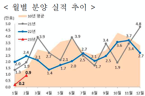 - 전국 미분양(호) : (’22.11월) 58,027 (12월) 68,148 (‘23.1월) 75,359 (2월) 75,438