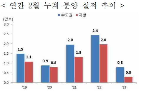 -2월 누계 공동주택 분양실적은 전국 10,945호로 전년 동기 (44,233호) 대비 75.3% 감소
