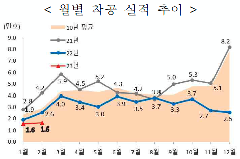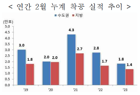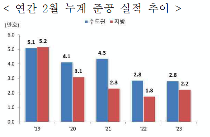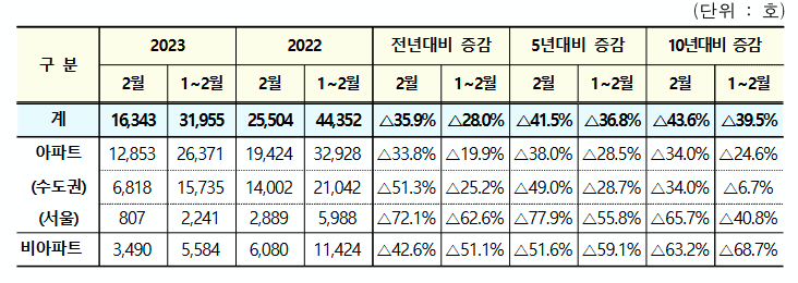 - 2월 누계 주택 착공실적은 전국 31,955호로 전년 동기(44,352호) 대비 28.0% 감소