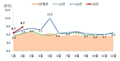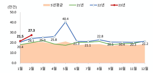 전년 동월(‘22.2월, 43,179건) 대비 4.6% 감소