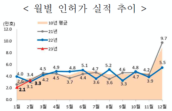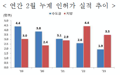 2월 누계 주택 인허가실적은 전국 54,375호로 전년 동기(70,128호) 대비 22.5% 감소하였다.