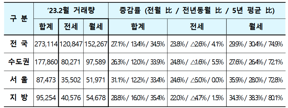 임대차 신고제 자료와 확정일자 신고* 자료를 합산한 ‘23.2월 전월세 거래량(신고일 기준)은 총 273,114건**으로 집계